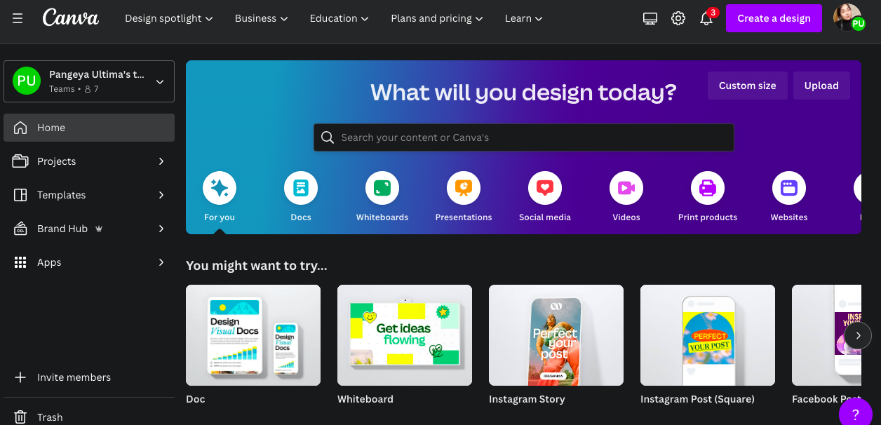 - Create a design: This is a powerful feature where you can start a design from scratch. You can choose the dimensions of your design or select from a variety of predefined sizes suitable for different purposes.