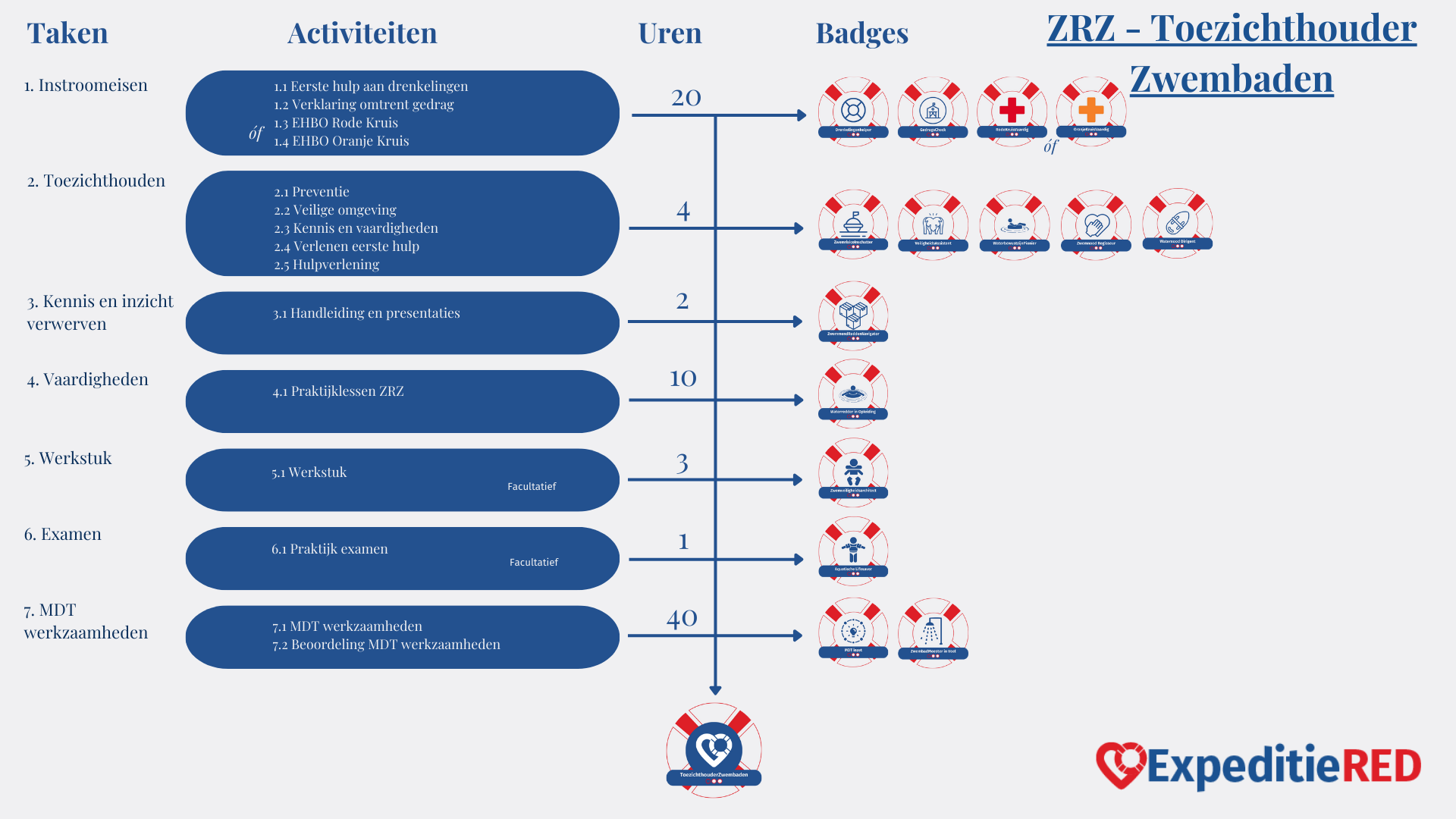 Je krijgt de masterbadge toezichthouder zwembaden als je alle activiteiten hebt gedaan en het praktijk examen hebt gehaald.