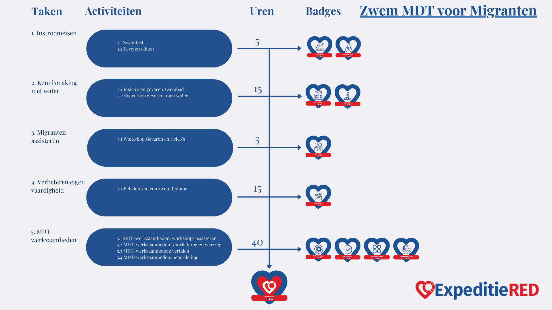You will receive approximately 40 hours of training and gain swimming experience yourself. You then work together with ExpeditieRED and with other migrants. The training is aimed at carrying out 5 tasks. A task has one or more activities, for which you receive a badge per activity. . This way you learn step by step.