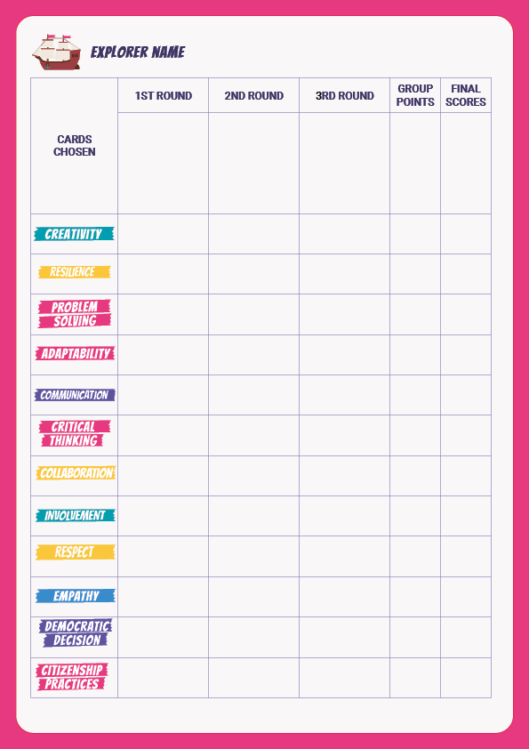 Puedes compartir la definición de cada competencia (puedes encontrarlas aquí) para facilitar la discusión. Cuando el grupo haya acordado las 4 competencias clave de inclusión para su objetivo, pega las fichas de las competencias elegidas en el tablero, en los cuatro lugares al lado del barco.