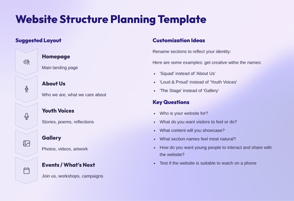 - Guía una sesión de planificación donde los jóvenes definan el tipo de sitio web que quieren crear: ¿qué propósito, tono y público?