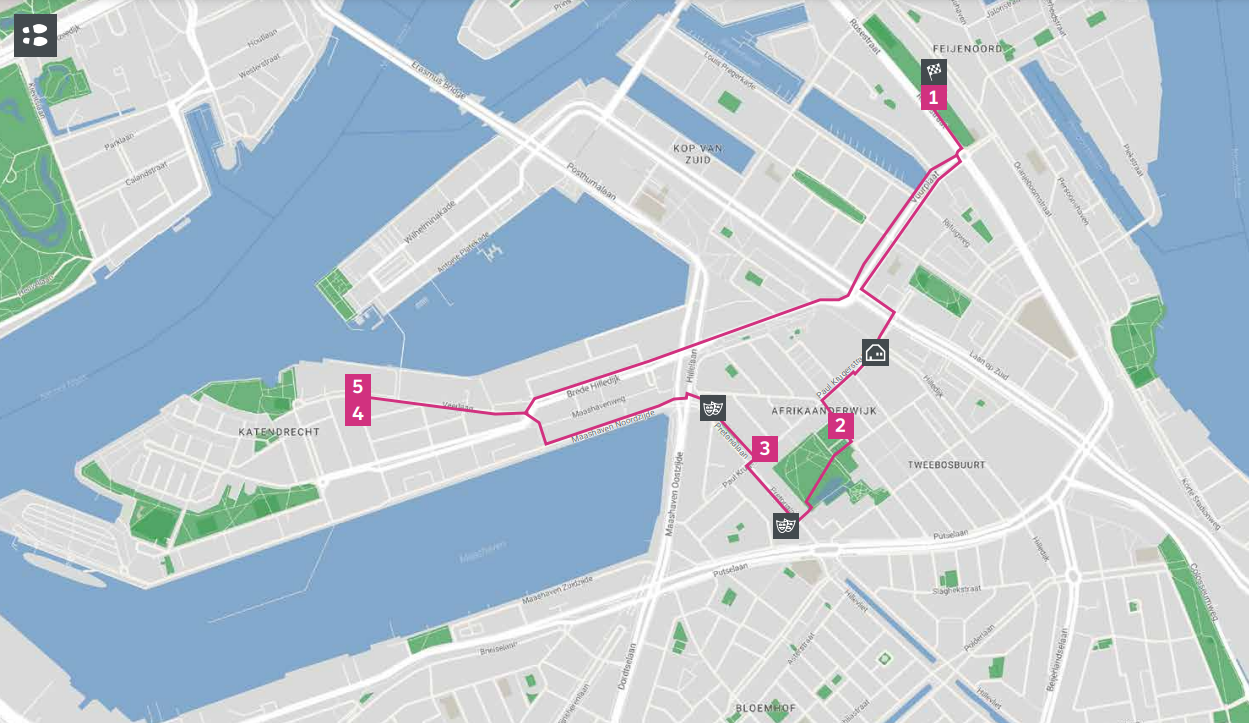 Met ziel en zaligheid zetten bewoners, ondernemers, de Rijksoverheid en de gemeente Rotterdam zich dagelijks in voor het verstevigen en verbeteren van Zuid. Dat zie je terug in allerlei activiteiten en initiatieven die in de wijken ontspruiten. Op het gebied van werk, wonen, scholing, cultuur en veiligheid. Al die activiteiten dragen bij aan de zelfstandigheid van mensen en de ontwikkeling van de buurten waarin zij wonen. Op deze wandelroute wandel je langs een aantal van de initiatieven op Zuid. Trek erop uit en ontdek het zelf: het bruist op Zuid.