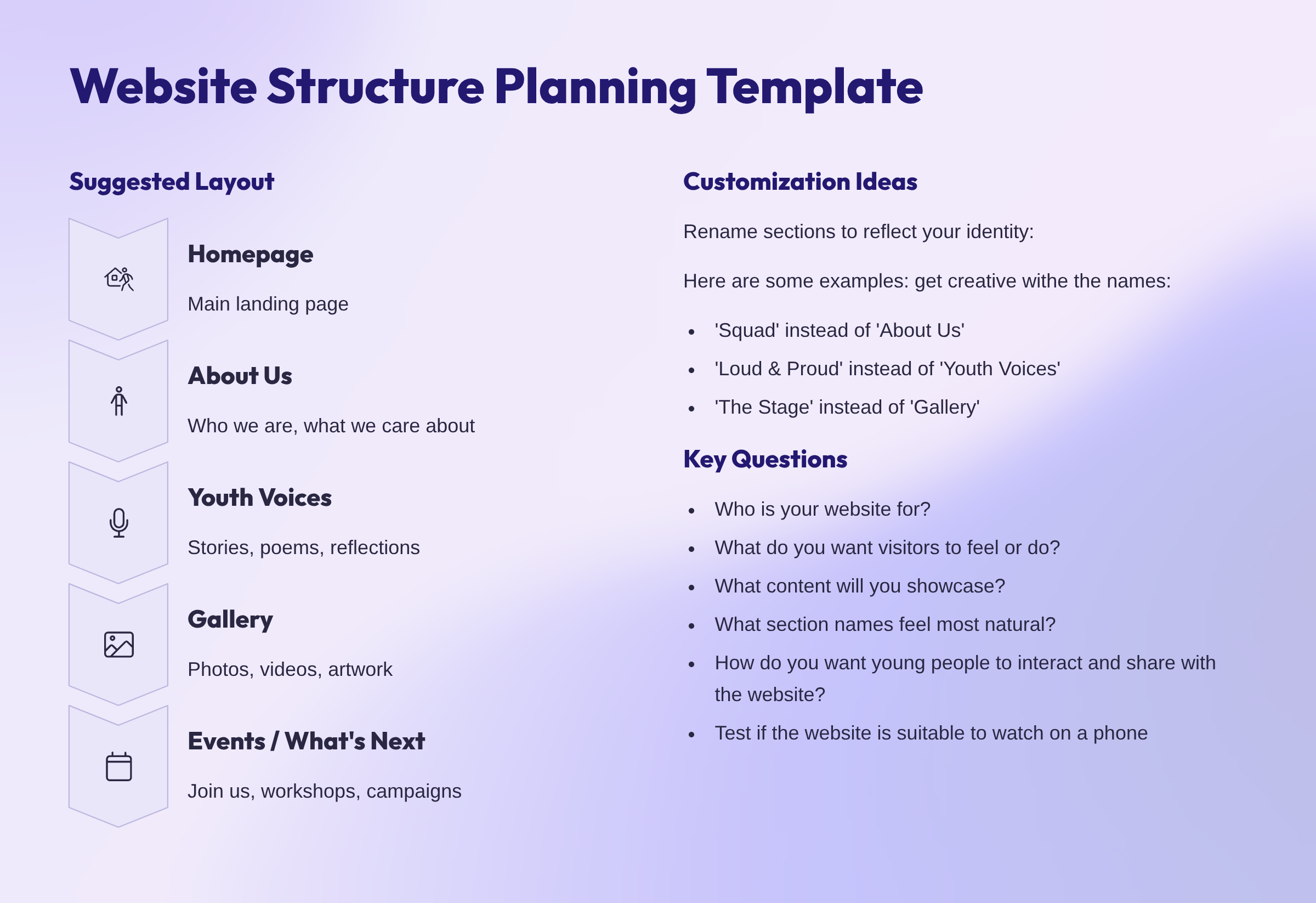 Deze badge is voor iedereen (jongere, jongerenwerker, of organisatie) die meewerkt aan de plannen en de visie voor een website geleid door jongeren. Deze badge erkent jouw rol in het bedenken hoe een website de stem van jongeren sterker kan maken, samenwerking kan helpen en een echt verschil kan maken — zelfs voordat de website online is.