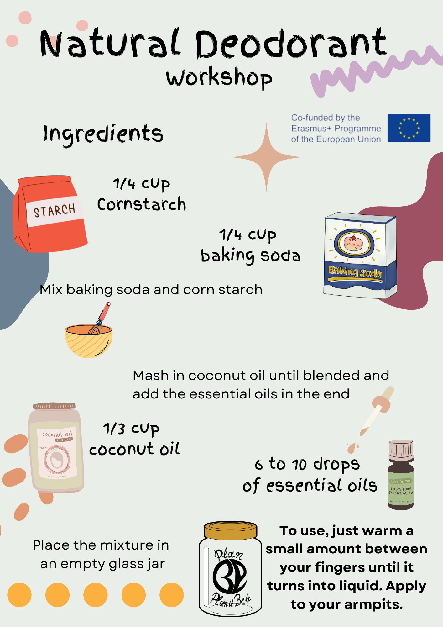 - Introduction to natural deodorant: The workshop could begin with an introduction to natural deodorant, which is made from natural ingredients such as baking soda, coconut oil, and essential oils. Participants would learn about the benefits of natural deodorant, including its ability to control odour without harsh chemicals or irritants.